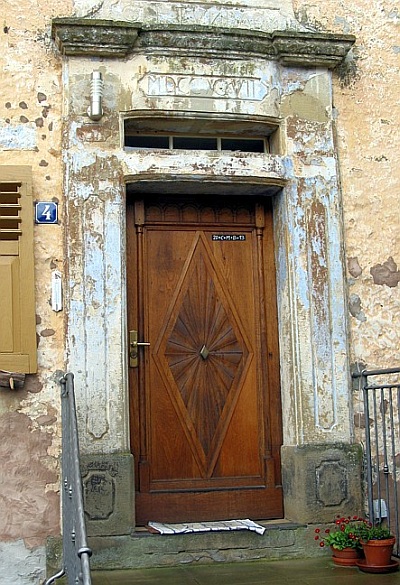Das Türblatt des frühen 19. Jahrhunderts Mit großer Strahlenraute hat sich zusammen mit den alten sprossengeteilten Fenstern und Fenstergittern an der Rückfront erhalten.