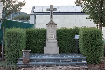 Schlichtes neugotisches, in Inschriftblende 1857 datiertes Stelenkreuz; das Balkenkreuz mit Metallkorpus. [1]