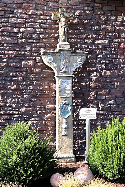 Etwa 2,7 m hoher Sandstein-Bildstock aus Pfeilerschaft, ausladendem Tragstein und ehemals vollplastischer Kreuzigungsgruppe. Den Schaft schmückt die Ausarbeitung der Stifterinschrift auf Schriftrolle (HAVPERICHS PETER VND SEIN HAVSFRAW JRMINA, 1687) und die Wappenkartusche mit Zirkel als Handwerkerzeichen. Am Kämpfer die Reliefdarstellung des hl. Agritius in Bischofstracht.