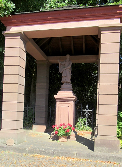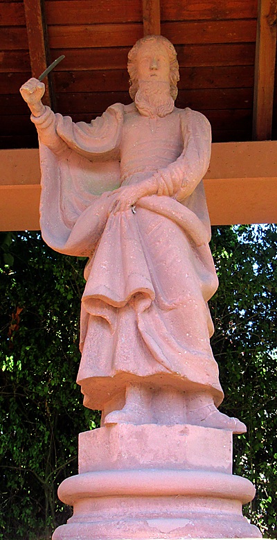 Sandsteinfigur des Kirchenpatrons auf Säulenbase. Das für eine Nischenaufstellung gearbeitete Bildwerk vom Ende des 18. Jahrhunderts war ursprünglich wohl für die Nische über dem Kirchenportal vorgesehen und wurde 1984 mit einem Pfeilerbaldachin geschützt. [1]