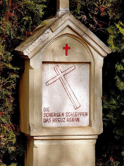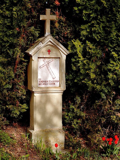 Entlang des auf die südliche Anhöhe führenden Bergweges und am Saum zum westlich davon gelegenen Weinberg stehende Kreuzweganlage von 1913. Vierzehn schlichte Sandsteinstationen, jeweils aus glattem Schaft, verdachtem Aufsatz und Abschlußkreuz; die Darstellungen neu. [1]