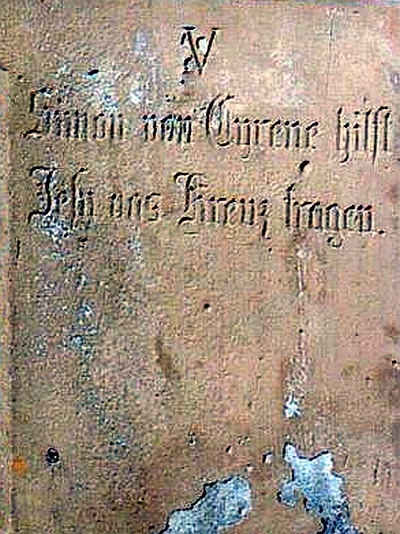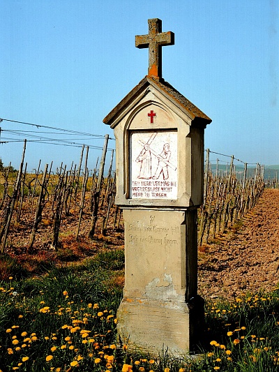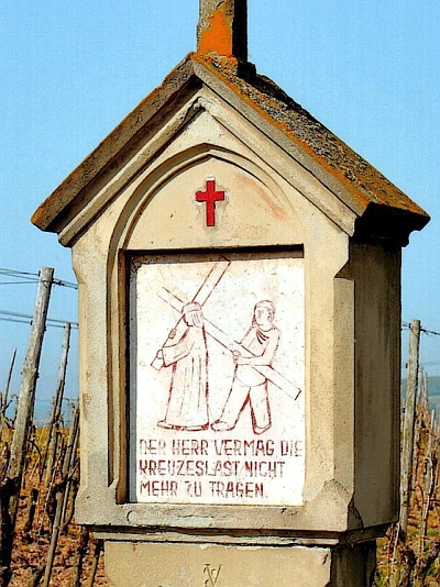 Entlang des auf die südliche Anhöhe führenden Bergweges und am Saum zum westlich davon gelegenen Weinberg stehende Kreuzweganlage von 1913. Vierzehn schlichte Sandsteinstationen, jeweils aus glattem Schaft, verdachtem Aufsatz und Abschlußkreuz; die Darstellungen neu. [1]