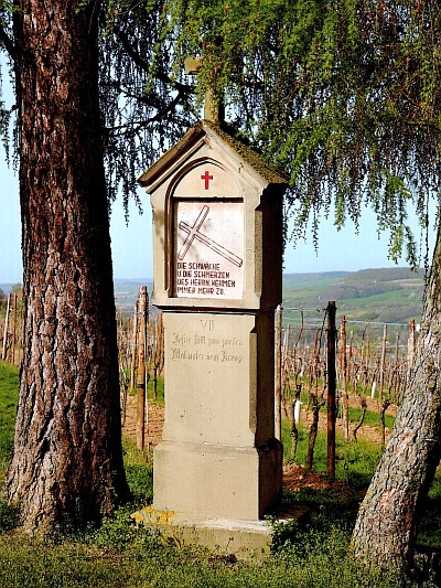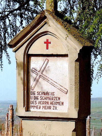 Entlang des auf die südliche Anhöhe führenden Bergweges und am Saum zum westlich davon gelegenen Weinberg stehende Kreuzweganlage von 1913. Vierzehn schlichte Sandsteinstationen, jeweils aus glattem Schaft, verdachtem Aufsatz und Abschlußkreuz; die Darstellungen neu. [1]