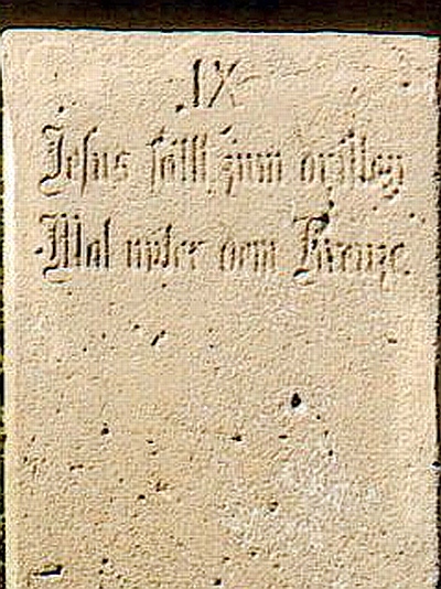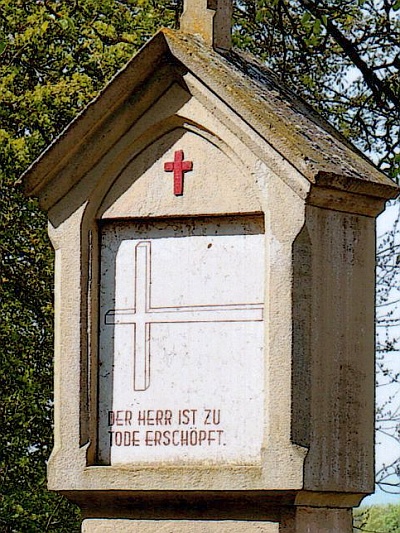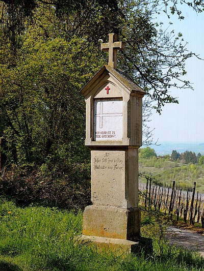 Entlang des auf die südliche Anhöhe führenden Bergweges und am Saum zum westlich davon gelegenen Weinberg stehende Kreuzweganlage von 1913. Vierzehn schlichte Sandsteinstationen, jeweils aus glattem Schaft, verdachtem Aufsatz und Abschlußkreuz; die Darstellungen neu. [1]