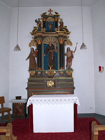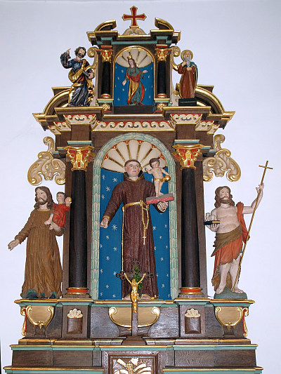 Holzaltar des 17. Jahrhunderts, charakterisiert durch spätes Knorpelwerk. In der Mittelnische die große Holzfigur des heiligen Antonius von Padua mit dem segnend auf einer Bibel stehenden Jesusknaben,zur Seite die Holzfiguren der heiligen Joseph und Johannes Evangelist. Gehänge von Fruchtwerk begleiten die Seitenkanten des Altars, im Aufbau eine einfache Figur der Mutter Gottes. [1]