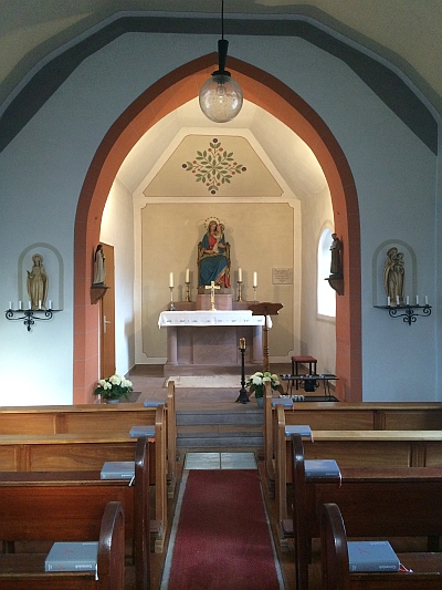 Kleiner Saal mit niedrigerem, aber gleich breitem Chor und quadratischem Dachreiter über der Eingangsseite. Angeblich 1909 erbaut, die Außenerscheinung jedoch noch ganz in der Tradition des 18. Jahrhunderts; der spitzbogige Chorbogen lässt immerhin einen historisierenden Einfluß erkennen. Die Decken von Schiff und Chor folgen dreiseitig gebrochen der Dachschräge bis zur Kehlbalkenlage.