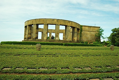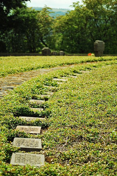Die in mehreren ringförmigen Reihen angelegten Gräber von 3 224 Soldaten laufen auf einen offenen Gedenkraum im Zentrum des Rings zu.