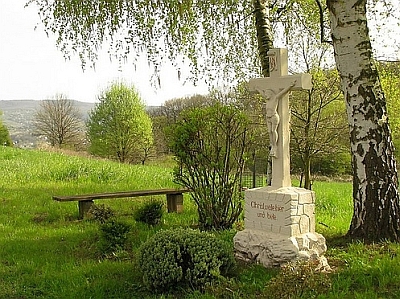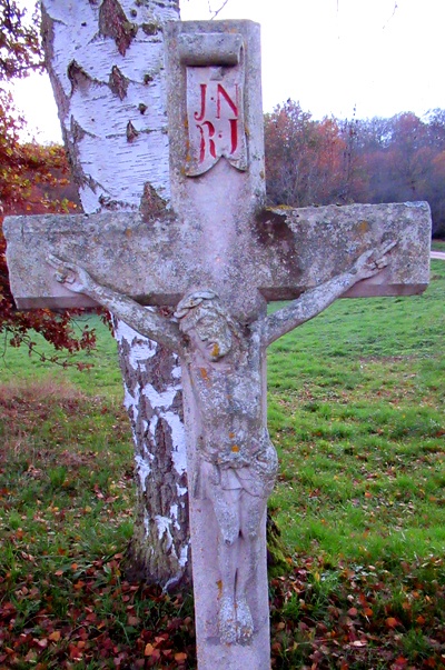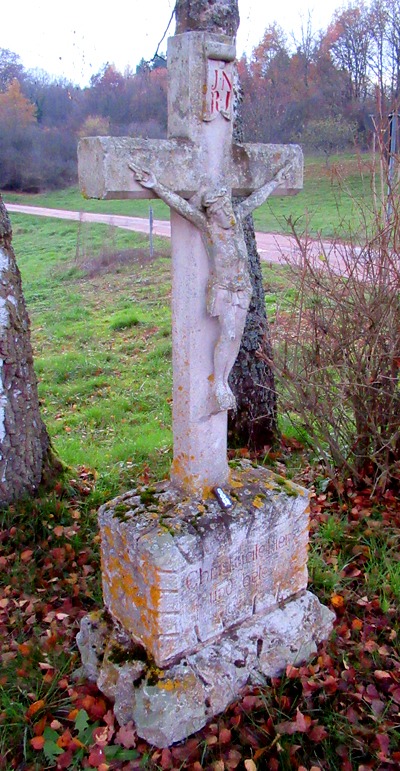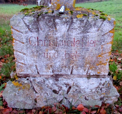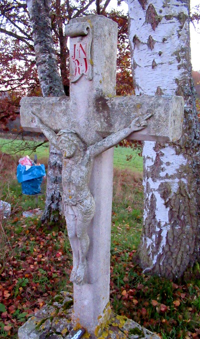Steinkreuz auf der Wiltinger Kupp. Sockel mit Verzierungen, Abschlusskreuz mit herausgearbeitetem Korpus.