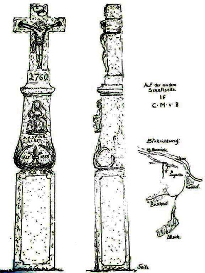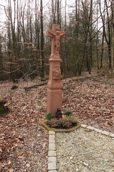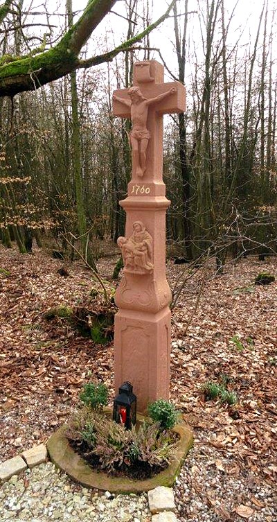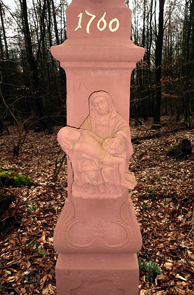 Wegekreuz nördlich der Ortslage im Wald, in der Nähe der Villa Altrich. Barockes Schaftkreuz mit Pietà, bezeichnet 1760, angeblich 1855 erneuert. [1]