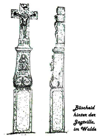 Im Walde hinter der Jagdvilla bei Büscheid steht an einem breiten Waldweg, gerade an der Abzweigung 2 weiterer Waldwege ein altes Steinkreuz. Es schaut sonderbarerweise weder nach dem einen noch nach dem anderen Weg, sondern es schaut nach der Altricher Pfarrkirche. Im Volksmund wird es das Kammerkreuz genannt und zwar soll es errichtet worden sein zum Dank für Gottes Schutz in Kriegs- und Pestzeit. Die Errichtungszahl 1760 allerdings weist weder auf eine Pest noch eine Kriegszeit hin. Der Sockelstein liegt zu ebener Erde. Auf einem hohen Schaftfuß steht ein Barockschaft mit bauchiger Verdickung des unteren Teils der mit Blattwerk versehen ist. Im oberen Schaftteil ist eine Pieta ausgehauen, die heute beschädigt ist.
