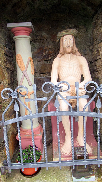 Ecce-Homo-Plastik nördlich der Ortslage an einem Weinbergsweg. Eingelassen in eine Mauernische die Figur eines sitzenden Schmerzensmannes und eine mit den arma christi belegte Säule, Sandstein, um 1700. [1]