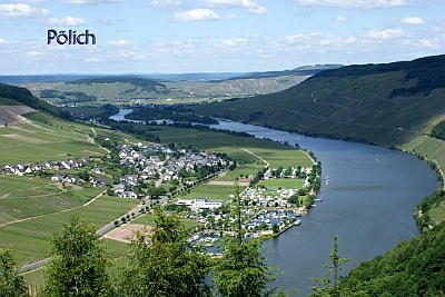 Wenn die erste urkundliche Erwähnung des Ortes Pölich auch nicht gerade ein rühmlicher Anlaß war, nämlich eine Hexenverbrennung, so wissen wir doch aus der Ableitung des Ortsnamens von pulchra villa (schönes Landhaus), daß auch hier die Römer siedelten. Wo kein Brunnen, da muß eine Wasserleitung her, dachten sich die alten Römer und führten von den Hängen der Voreifel das für die Bäder und den Verzehr benötigte Wasser in den Ort. Wer sich einen Eindruck einer solchen antiken Wasserleitung verschaffen möchte, der mag sich die Ausgrabungen und die Rekonstruktionen oberhalb der Kirche ansehen. Dort wurde die zu einer Badeanlage eines römischen Gutshofes gehörige Wasserzuleitung in den Weinbergen freigelegt. Einst zum Königshof Detzem gehörend kam auch Pölich im Jahre 634 in den Besitz der in dieser Gegend reich begüterte Abtei Sankt Maximin. [1]