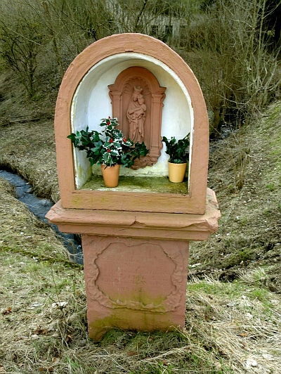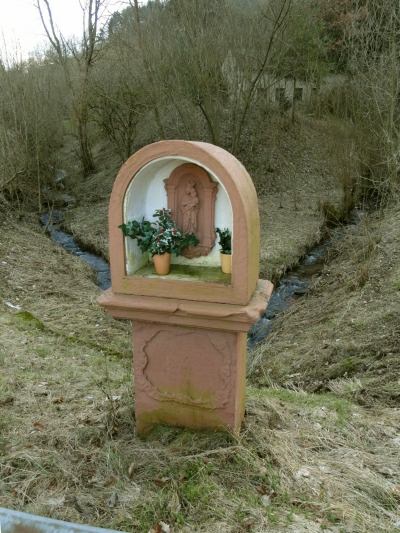Meerbachstraße, am südlichen Ortsausgang. Heiligenhäuschen aus rotem Sandstein in barocken Formen, am Sockel bezeichnet 1862. [1]
