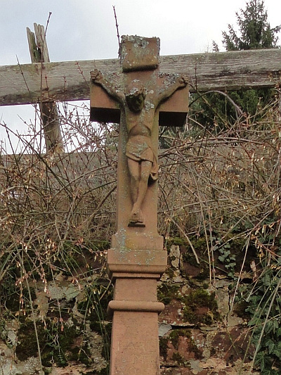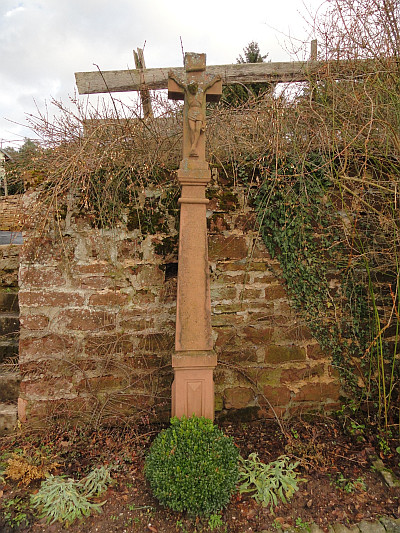 Im Hüttenberg, an der Einmündung in die Töpferstraße. Schaftkreuz in klassizistischen Formen, bezeichnet 1852. [1]