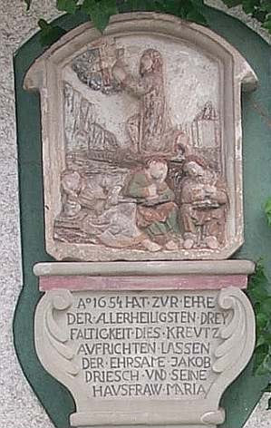 (A) Jakob und Martha Driesch Jakob und Martha(!) Driesch, die Stifter des ersten Bildstockes, ließen in der Clemenskirche zwischen 1607 und 1615 fünf Kinder taufen: Anna 28.9.1607, Barbara 25.5.1609, Susanna 6.11.1611, Margaretha 30.3.1613 und Johann 3.3.1615). Ihr jüngster Sohn, Johannes (geboren 1615), tritt später als Mattheyßer Mayer und Hoffmann in Erscheinung; sofern letzterer mit Hans Driesch identifiziert werden kann, nahm er auch die Aufgabe eines kirchlichen Synodalen wahr. Jakob Driesch selbst erscheint in der Steuerliste des Jahres 1654 nicht. So legt sich die Vermutung nahe, dass seine Erben diesen Bildstock ihm zu ehren stifteten. Joannes Trirsch wird als trierischer Untertan mit 969 Florin eingeschätzt. - Sollte es sich bei der Person des Jakob Driesch tatsächlich um den 1629 in einem Hexenprozess (Anklage Zauberey) angeklagten und zum Tode veRuhrteilten und schließlich auch hingerichteten früheren Synodalen handeln ? Dies würde einerseits das Fehlen in der Steuerliste des Jahres 1654 erklären - und würde womöglich bedeuten, dass die Errichtung des Bildstocks auch als eine Art familiäre Rehabilitation oder sogar als ein Mahnmal zu deuten; das Symbol der Waage ließe sich dann im Sinne des Symbols der wiederhergestellten Gerechtigkeit verstehen.