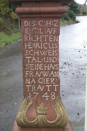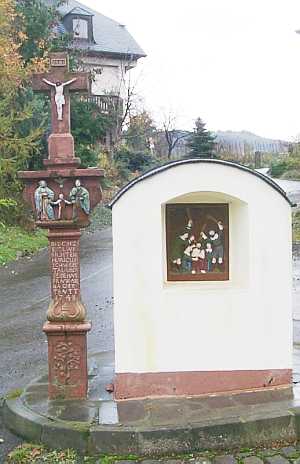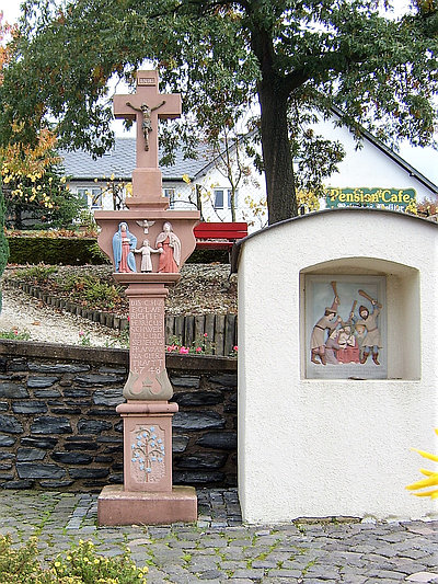 Kreuzigungsbildstock, bezeichnet 1748. Früherer Standort: Kröver Straße, Abzweigung Am Bildstock. [1]