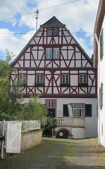 Stattlicher, zurückliegender Bau von zwei Geschossen. Das Erdgeschoß massiv, am Oberlichteingang bezeichnet 1700. Sonst sehr gut erhaltenes Schmuckfachwerk wohl der gleichen Zeit. [1]