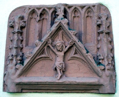 Neben dem Portal eingemauert ein kleines gotisierendes Kreuzigungsrelief von 1671. [1]