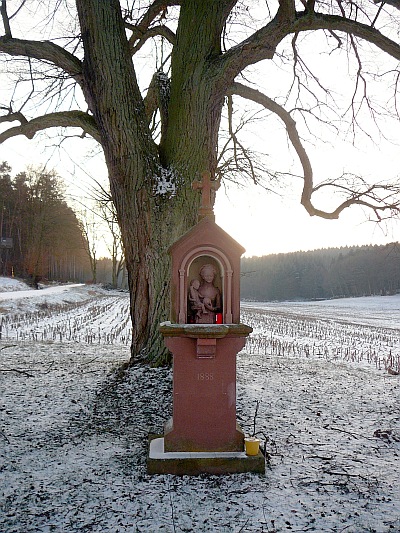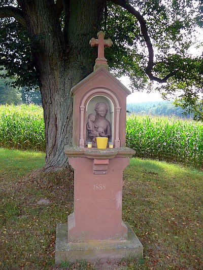 Heiligenhäuschen südwestlich der Ortslage an einem Feldweg (Distrikt "Am Bildchen"). Vollständig aus rotem Sandstein in romanisierenden Formen gearbeitet, bezeichnet 1888. [1]