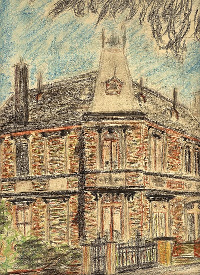 Übereck angelegter Bau aus unverputztem Schiefermauerwerk mit Sandsteingliederung in Neurenaissanceformen, bezeichnet 1894. Vorgarten mit bauzeitlicher Einfriedung. [2]