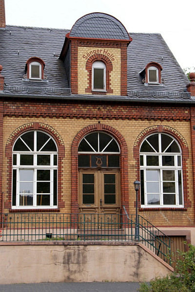 Eingeschossiger, traufständiger Bau mit gelb-roter Klinkerfassade, um 1900. Große Rundbogenöffnungen, bauzeitliche Tür. [1]