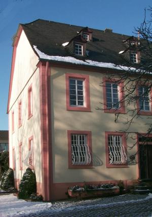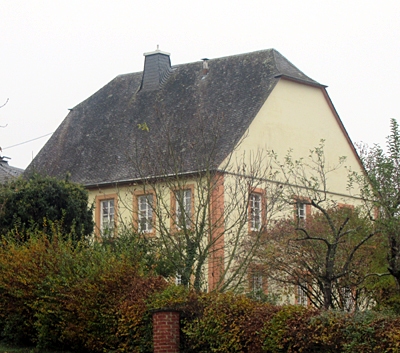 Zweigeschossiger Putzbau mit Krüppelwalmdach, am rechteckigen Oberlichteingang bezeichnet 1789. Die Gesamtanlage umfaßt das freistehende Wirtschafts- bzw. Remisengebäude, ein weiteres Nebengebäude sowie den Torbogen an der Zufahrt von der Bernkasteler Straße, bezeichnet 1772. [1]