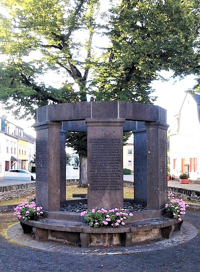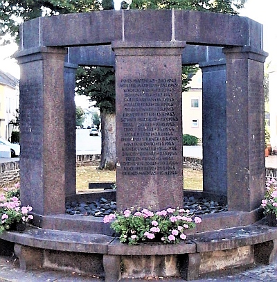 Kriegerdenkmal des Ersten und Zweiten Weltkriegs in Form eines kleinen offenen Rundtempels. Von einer niedrigen Bruchsteinmauer umgebene Grünanlage mit altem Baumbestand [1]