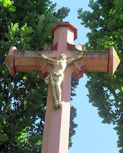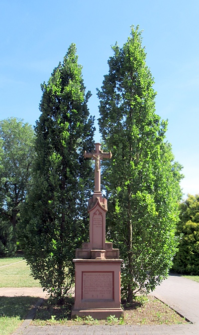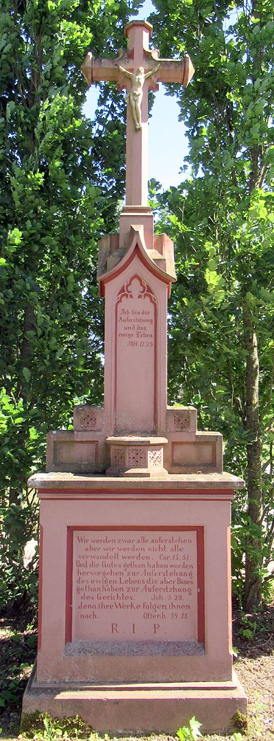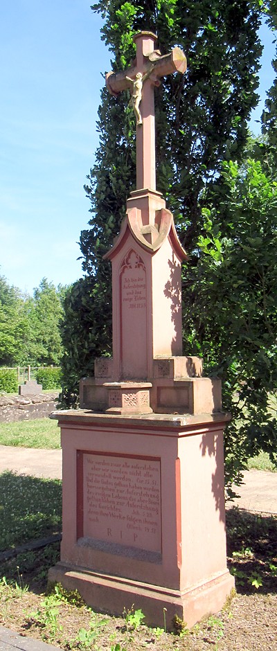 Im Neugarten, an der Abzweigung In der Hiehl, auf dem Friedhof. Friedhofskreuz in neugotischen Formen aus rotem Sandstein, nach Mitte 19. Jahrhundert. Signiert "Gebrüder Meilen in Wittlich". [1]