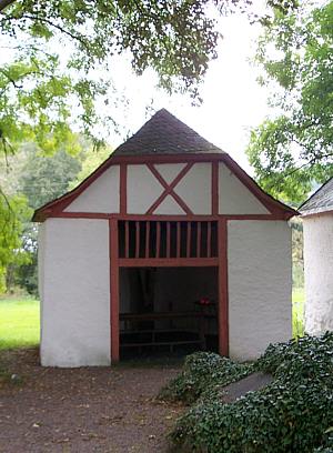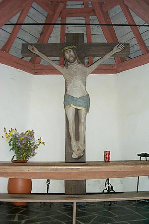 Die ältere der beiden Kapellen ein dreiseitig geschlossener Putzbau mit Fachwerkgiebel, bezeichnet 1741; innen der sogenannte "Große Herrgott", ein überlebensgroßes, bäuerlich derbes Kruzifix des 17. Jahrhunderts.