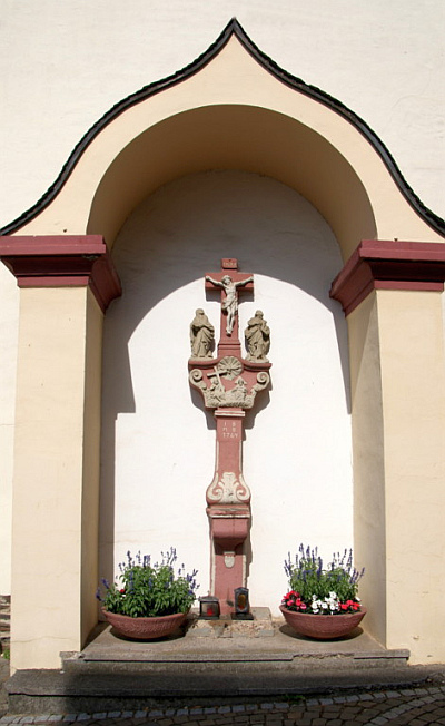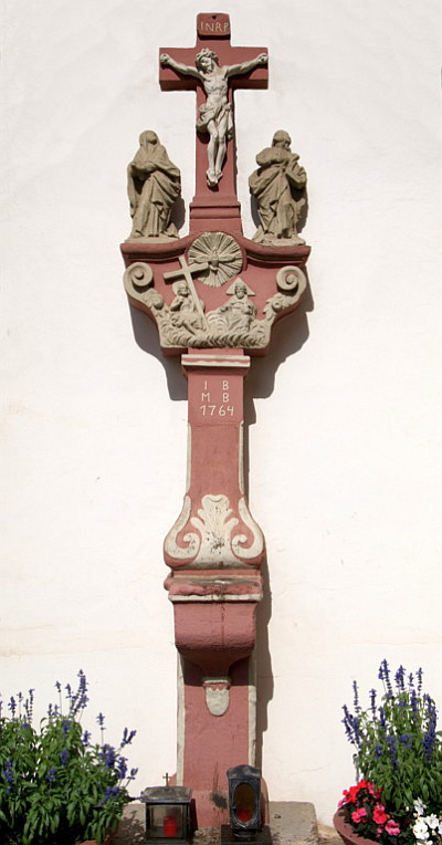 Sandsteinkreuz mit Kalvarienberggruppe. Darunter befindet sich auf einer Konsole ein Reliefbild der Hl. Dreifaltigkeit. Das etwa 3 m hohe Kreuz trägt die Inschrift: JB - MB - 1764 [2]