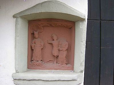 Heiligenhäuschen aus rotem Sandstein, eingelassen in die Hauswand. 17. / 18. Jahrhundert. Die Reliefszene stark beschädigt. [1]