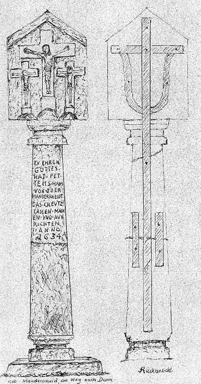 Das sogenannte Frienen-Kreiz (Fronde-Kreuz) wurde vom Heimatmuseum an die Kirchenmauer der Pfarrkirche - gegenüber Haus Kirchstraße 9 versetzt. Es handelt sich um das Original. Eine Kopie steht am ursprünglichen Standort an der Landesstraße 46 zwischen Manderscheid und Bleckhausen.