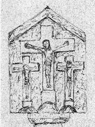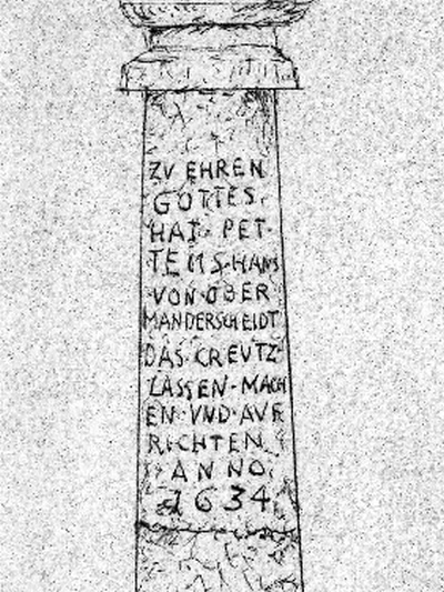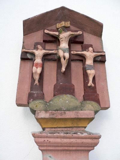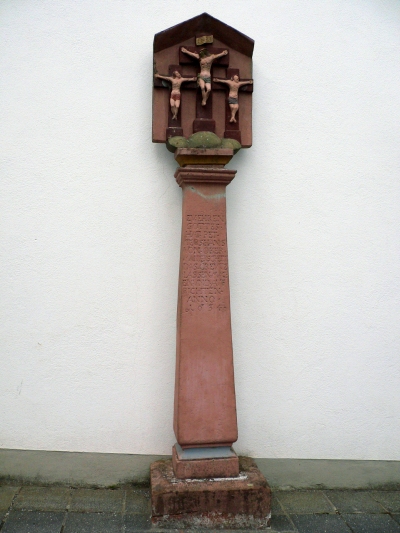 Das Kreuz mit der Kreuzigungsgruppe aus Sandstein trägt folgende Inschrift: