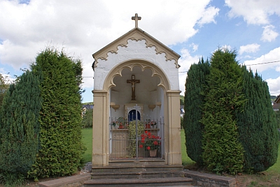 Am südlichen Dorfrand zum Sauerufer gerichtete neugotische Wegekapelle, laut Inschrift am Steinaltar 1884 von Witwe Schilz, geborene Hoffmann aus Edingen errichtet. [1]