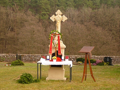 Südlich der Kirche das Kirchhofskreuz in neugotischen Formen, 2. Hälfte 19. Jahrhundert. [1]