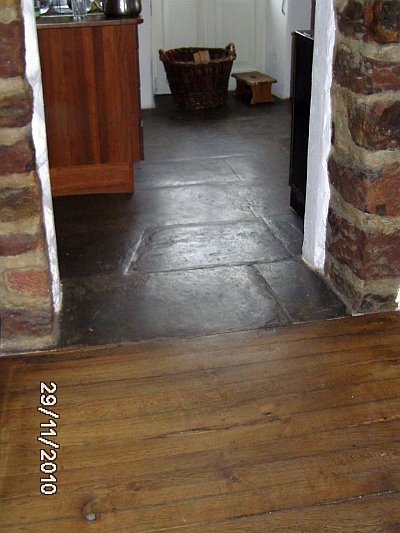 Der Küchenboden besteht aus handgefertigten Sandsteinplatten, die wo nötig mit im Haus verbliebenen Platten ergänzt, neu verfugt und anschließend geölt wurden.