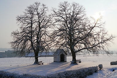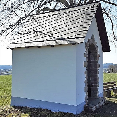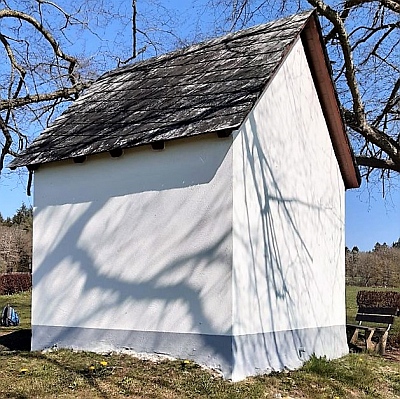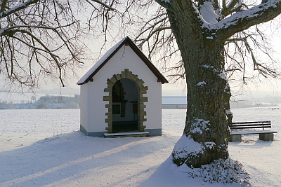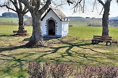 Malerisches Heiligenhäuschen, das in den 60er Jahren errichtet wurde, mit einer aus rötlichem Basalt gefertigten Pietà. [1]