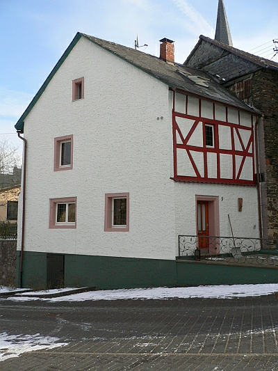 Eines der ältesten Häuser Manderscheids. Teilweise ist das Fachwerk (auch auf der abgewandten Seite) noch sichtbar. Die kleinen Fenster sind noch in Originalgröße erhalten geblieben. Früher wohnte in diesem Hause "Lanteren Pitter" (Laternen-Peter), die letzte von der Gemeinde angestellte Person, die am Abend die Gas-Straßenlaternen anzündete. [1]