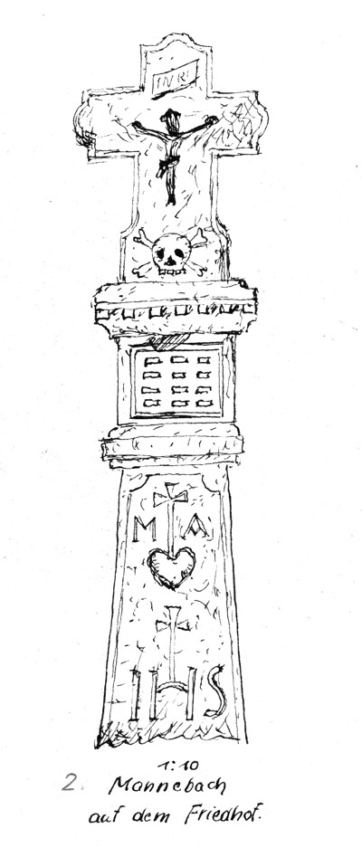 "Das zweite Kreuz (damit ist das 2. Kreuz in Mannebach in seiner Aufzählung gemeint) steht auf dem Friedhof an bevorzugter Stelle. Es soll aus der alten Kapelle stammen, die hier auf dem Friedhof vor der Pfarrkirche stand. Es wäre auch möglich, dass es ein altes Feldkreuz ist, das man zur Sicherung hier auf dem Friedhof brachte. Der untere Teil fehlt und so steckt der Schaft noch zum Teil in der Erde. Auf dem Schaft ist hier ebenfalls das Christusmonogramm ausgehauen und darüber ein Herz mit einem draufstehenden Kreuz. Dazu stehen rechts und links des Kreuzes die Buchstaben M A. Es ist wohl das Namenmonogramm des Errichters. Das Kapitell hat Ähnlichkeit mit dem davor beschriebenen Kreuz (Kreuz am Bürgerhaus, Nr. 4) und es dürfte auch aus derselben Zeit stammen, also um 1830 errichtet worden sein. Als Abschluss ist ein Steinkreuz aufgesetzt mit einem Eisenkorpus und mit Kreuzschild. Zu den Füßen des Gekreuzigten ist ein Totenkopf mit gekreuzten Knochen dargestellt; wir haben es wohl mit einem Totengedächtniskreuz zu tun."
