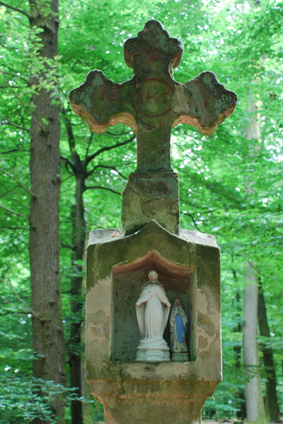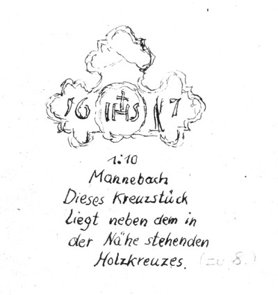 Neben dem Sandsteinkreuz ein 1879 bezeichnetes kleines Holzkreuz. Ungeklärt ist der Zusammenhang der Kreuzsetzung an diesem Weg, den in der Gemarkung von Fisch ein weiteres, noch älteres Nischenkreuz (Steffeskreuz) säumt.
