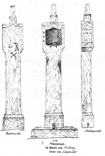 Der auf einem Setzsockel gestellte, kantige Pfeilerschaft schließt mit einem tiefen Nischenaufsatz ab, dem auch an den schmäleren Seiten flachkurvige Abschlüsse beigegeben sind. Die rückseitig eingegrabenen verwitterten Zeichen sind nicht gedeutet, könnten jedoch ein Hauszeichen mit Namen darstellen. Das ursprüngliche Abschlusskreuz ist nicht mehr vorhanden.