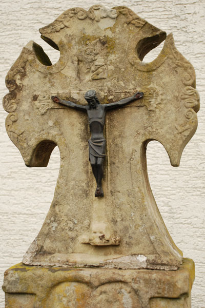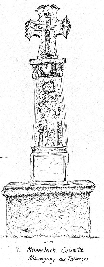 Der Überlieferung nach wurde in früheren Zeiten bei diesem Kreuz ein Fronleichnamsaltar errichtet und dass sich die Fronleichnamsprozession damals talaufwärts an drei weiteren Kreuzen vorbeibewegte. Diese standen alle an dem sonntäglichen Kirchweg nach Rehlingen-Littdorf. Mannebach wurde erst im Jahre 1804 eine eigene Pfarrei. Der hohe, wie ein Altartisch wirkende Sockelstein, ist älter als das Kreuz selbst. Er ist heute zum Teil in den Boden eingelassen.
