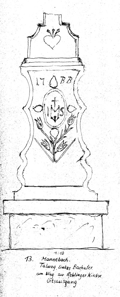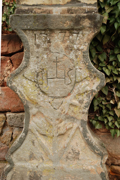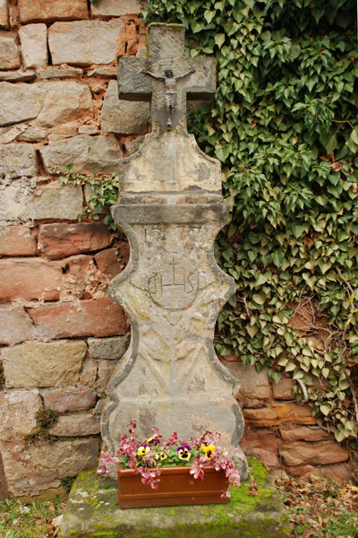Der lebhaft, in Art des Rokoko konturierte, jedoch derb gearbeitete breite Schaft des Kreuzes auf niedrigem Sockel trägt in einem mittleren Oval über einem filigranen Blumenornament das IHS-Zeichen mit Kreuz und drei Nägeln. Darüber die Datierung 1777, hinter der zwei B eingraviert sind, wohl das Namensmonogramm des Errichters. Auf dem einfachen Kapitell ein sich verjüngender Aufsatz, der durch ein Steinkreuz aus Buntsandstein mit Kruzifix abgeschlossen wird.