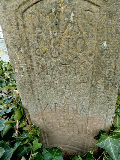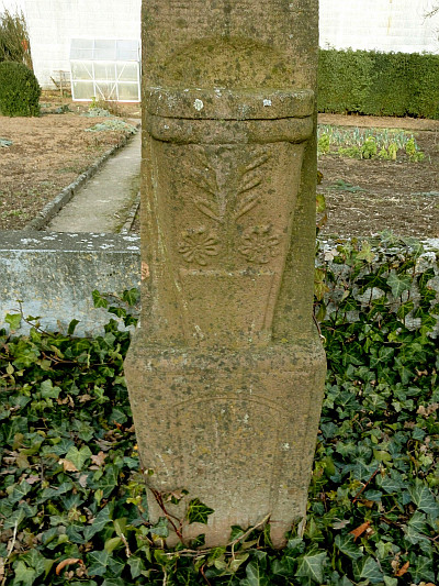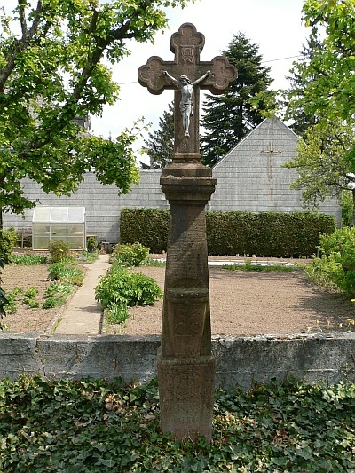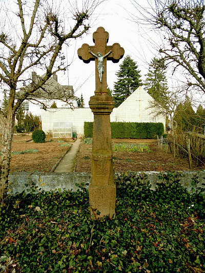 Sandsteinkreuz am Kirchenvorplatz. Das Kreuz trägt die Inschrift: 1810 - MATHIAS PIAS - ANNA KLEIN