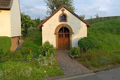 Etwa einhundert Meter von der Ortsmitte, am Weidenbacher Weg, steht ein kleines Heiligenhäuschen, das für das religiöse und kirchliche Leben in Wallenborn eine große Bedeutung hat. Viele Menschen gehen entweder allein oder pilgern in Prozessionen dorthin, um die Muttergottes um Hilfe zu bitten bei schwerer Krankheit, für Sterbende, bei Unglücken oder Todesfällen. Sie erflehen die Hilfe der Mutter Maria und danken für die Erhörung Gottes. Fast täglich besuchen Betende das K apellchen aus persönlichen Anlässen oder aus Frömmigkeit. Ursprünglich befand sich am Standort des Heiligenhäuschens nur der jetzt noch vorhandene gemeißelte Sandstein mit der Inschrift: Gewidmet von der Familie Kuhl 1885.