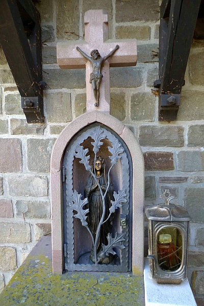 Dieses Kreuz wurde errichtet als Gedächtniskreuz an der Gartenmauer des ehrmaligen Hauses Piroth (Kolonialwaren Piroth), das 1986 abgerissen wurde. An dieser Stelle befindet sich jetzt der neue Dorfplatz. Das Kreuz fand nach erfolgter Restaurierung seinen neuen Standort an der Südseite des Platzes unter einer Schieferüberdachung. Auf einem rechteckigen, gegliederten Pfeiler steht: auf einer kapitellartigen Verzierung die Nische mit aufgesetztem Balkenkreuz. In der Nische befindet sich hinter einem Gitterschutz eine neue Muttergottesfigur.
