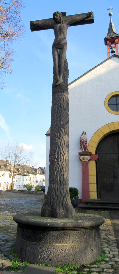 [...] Aus einem gemauerten kreisförmigen Sockel von 1,38 m Höhe und 0,56 m Durchmesser steigt ein naturalistisch gehaltener Baumstamm auf (Stein, Höhe etwa 3,50 m). Er bildet am oberen Ende ein Kreuz, an dem der 1,58 m hohe hölzerne Kruzifixus hängt. Kruzifix und Baumstamm ein Beispiel des spätgotischen Stiles in Trier. [1]