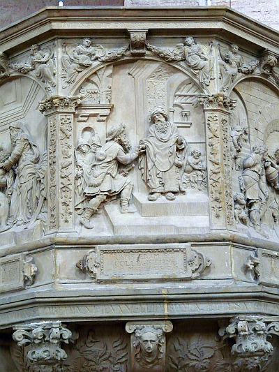 Die kunstgeschichtliche Bedeutung der Kanzel besteht nach dem Gesagten darin, daß sie, wie ein zur Entfaltung bereiter Keim, die für das deutsche Kunstleben der Spätrenaissance maßgebenden belgischen Schulen zusammenfaßt und zugleich die ersten Regungen des selbständigen deutschen Frühbarocks verrät. Geschichtlich genommen ist sie Denkmal der Gegenreformation; ihre Stiftung durch das Domkapitel wurde offenbar veranlaßt durch die im Jahre 1560 erfolgte Übertragung der Dompredigt von den Dominikanern an die Jesuiten. [1]