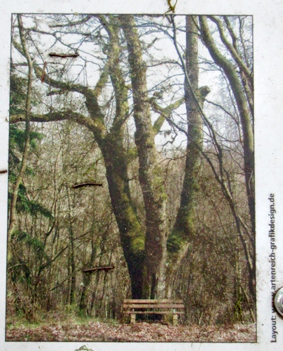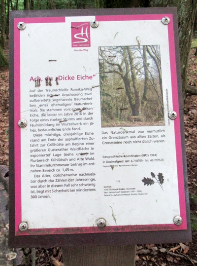 Auf der Traumschleife Romika-Weg befinden sich zur Anschauung zwei aufbereitete sogenannte Baumscheiben eines ehemaligen Naturdenkmals. Sie stammen von einer dicken Eiche, die leider im Jahre 2016 in der Folge eines starken Sturms und durch Fäulnisbildung im Wurzelwerk ein jähes, bedauerliches Ende fand.