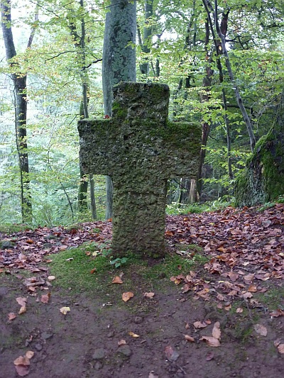 Das alte Kreuz wurde 1724 aufgestellt und ist seit Ende der 70er Jahre verschwunden und nicht mehr aufgefunden worden. Das heutige Kreuz wurde aus einem alten halben Mühlstein, welcher in der Nähe der Eishöhlen gefunden wurde, von Lorenz Brück und Adam Wirtz gehauen und am 07.11.1990 an den alten Standort gesetzt. [1]